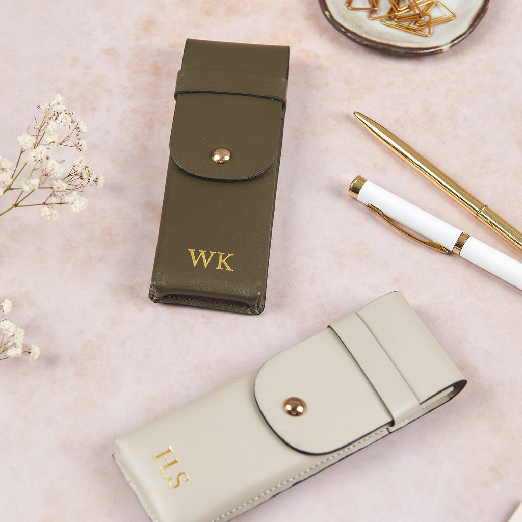 A handcrafted Italian leather pen/pencil case, perfect for storing 1 to 4 pens. The case can comes packed in a reusable linen drawstring bag. This is the perfect desk accessory or gift for anyone. Personalise with your initials to add a lovely, luxurious touch.